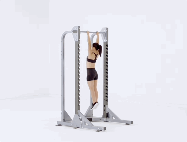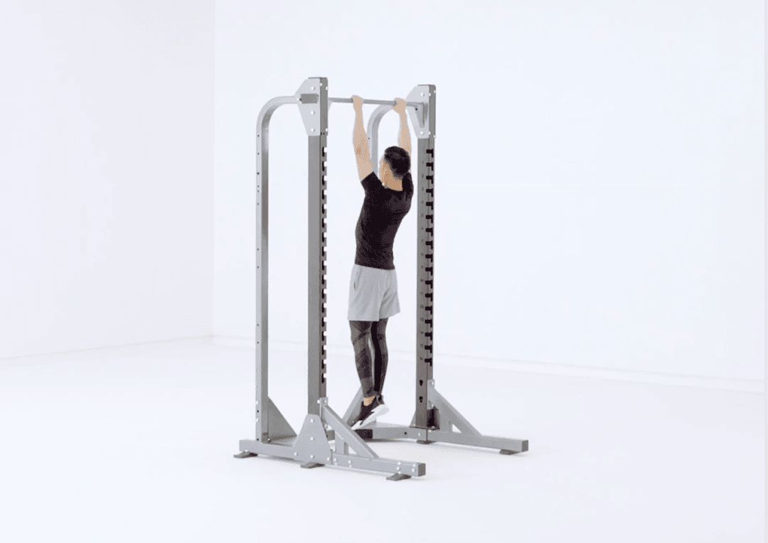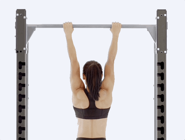 - Start by hanging from the bar with an overhand grip, slightly wider than shoulder-width apart.