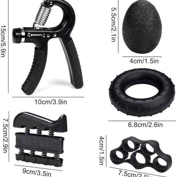 The kit includes five essential tools to target various aspects of hand, wrist, and forearm strength: