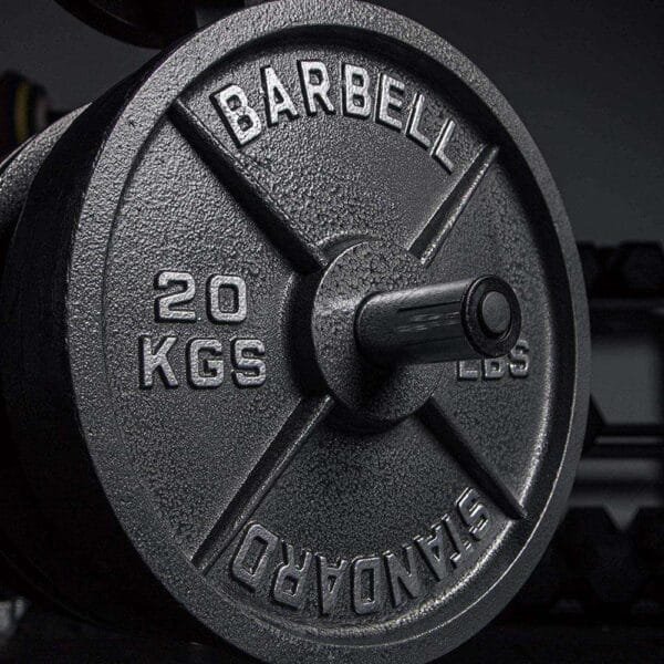 Each plate is meticulously labeled with pounds (LB) and kilograms (KG), featuring raised digits highlighted in white paint against a black matte finish. This design ensures that weights are instantly recognizable from a distance, eliminating the guesswork when setting up your barbell. The clear markings make it simple to switch between different training metrics, accommodating various international standards.