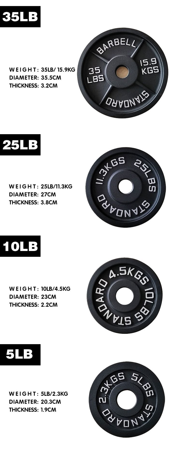 This package includes six plates: two 10lb, two 25lb, and two 45lb. Each plate has a 2-inch opening, suitable for most standard barbells. The durable, black-baked enamel finish not only provides a sleek look but also protects the plates from rust and corrosion, ensuring long-lasting performance without emitting any unpleasant odors.