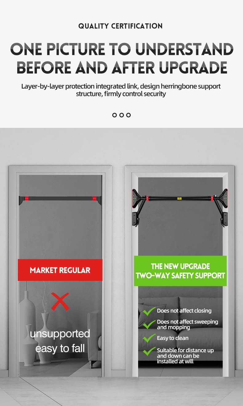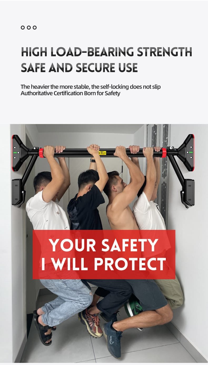 Unlike other pull-up bars that have only two support points and can easily fall off, our bar boasts four secure support points. The robust three-level gear lock ensures that the bar remains firmly in place, regardless of the intensity of your workout.
