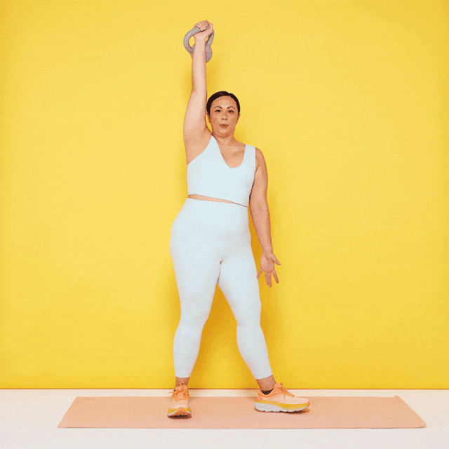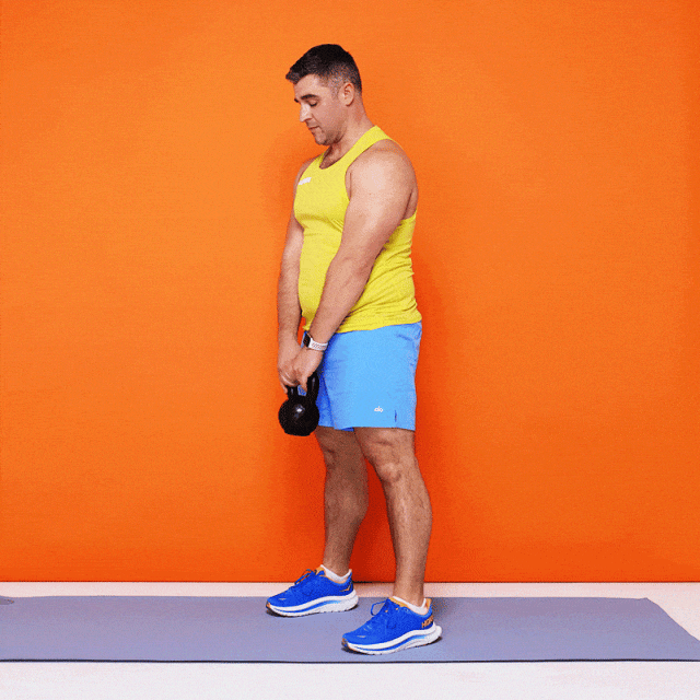 - Hold a kettlebell or barbell in front of your thighs.