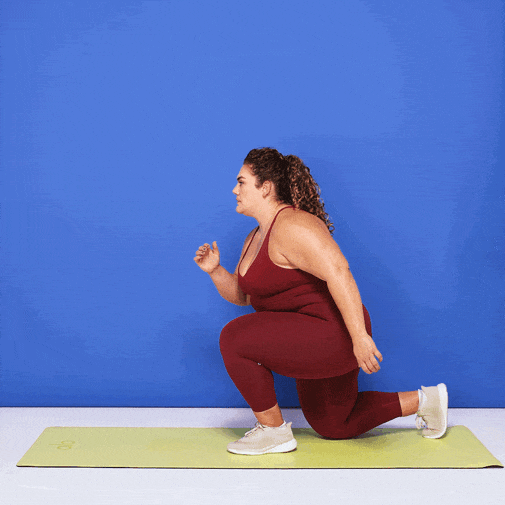 - Step forward with one leg, lowering your back knee toward the floor.