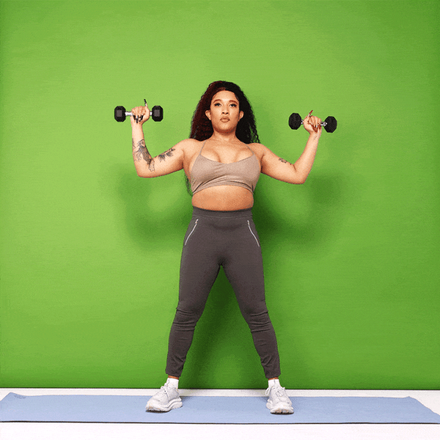 - Hold a dumbbell in each hand at shoulder height, palms facing forward.